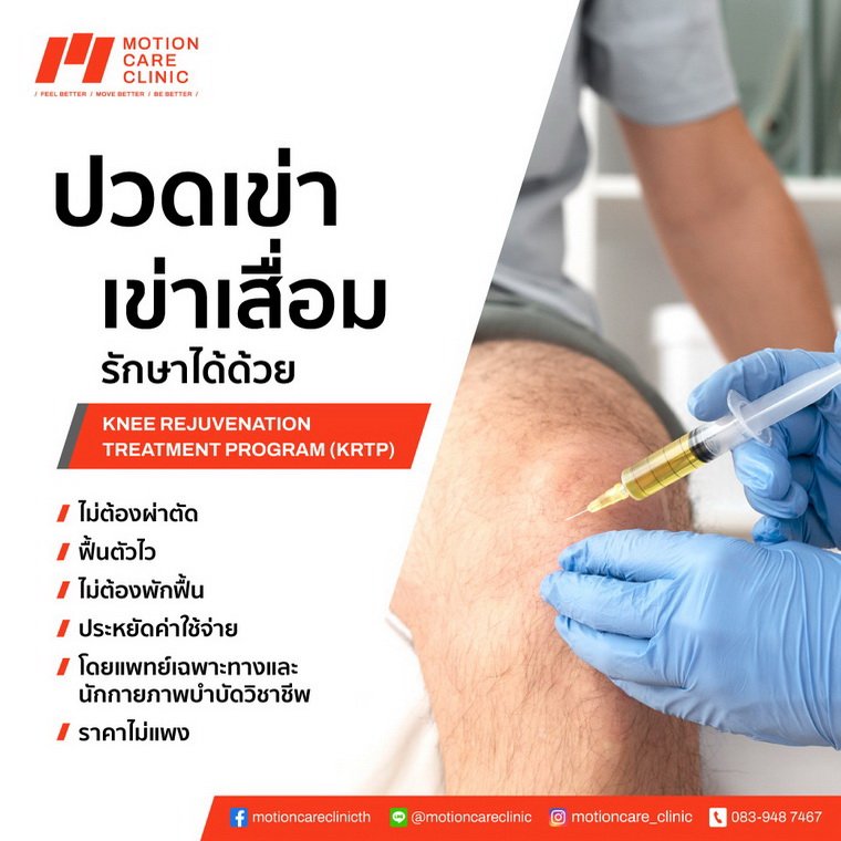 ทาง motion care clinic ขอแนะนำวิธีการรักษาฟื้นฟูแบบไม่ผ่าตัดด้วย knee rejuvenation program (KRTP) ซึ่งเป็นการรักษาแบบผสมผสานระหว่างการกายภาพบำบัดร่วมกับการฉีดเกล็ดเลือดเข้มข้นของตัวเอง (PRP) ซึ่งจะช่วยลดการอักเสบของผิวข้อร่วมกับเพิ่มโอกาสซ่อมแซมฟื้นฟูเนื้อเยื่อกระดูกอ่อนได้มากกว่าภาวะปกติหลายเท่า