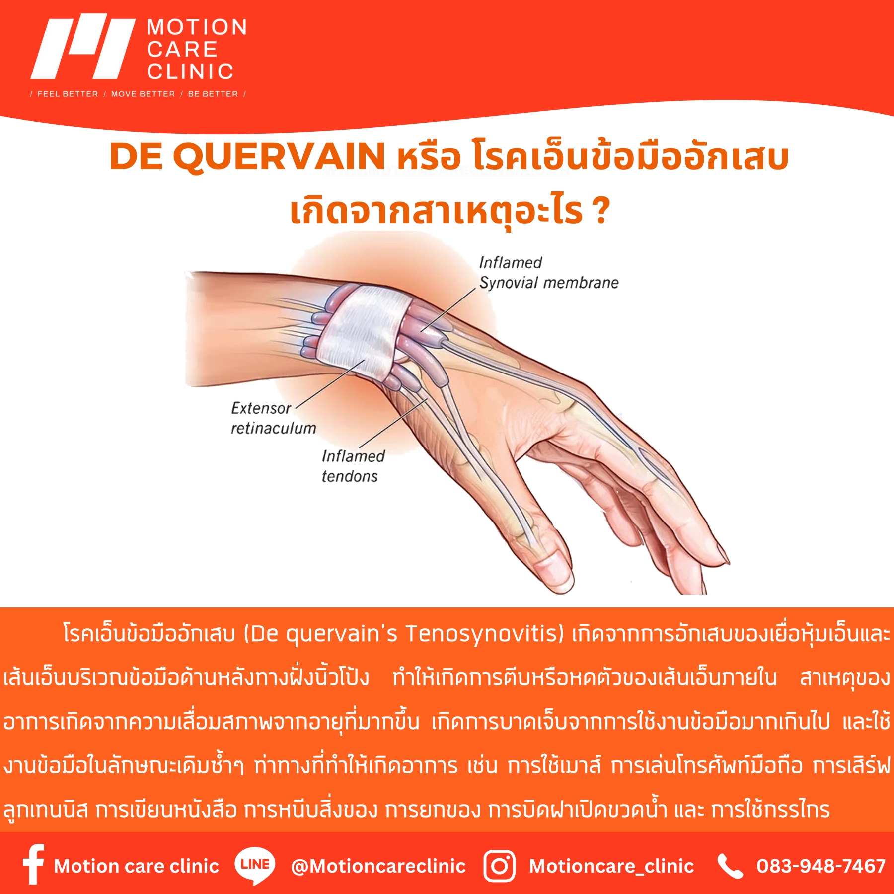 โรคเอ็นข้อมืออักเสบ (De quervain’s Tenosynovitis) เกิดจากการอักเสบของเยื่อหุ้มเอ็นและเส้นเอ็นบริเวณนิ้วโป้ง ทำให้เกิดการตีบหรือหดตัวของเส้นเอ็น สาเหตุของอาการเกิดจากความเสื่อมสภาพจากอายุที่มากขึ้นหรือจากการใช้งาน เกิดการบาดเจ็บจากการใช้งานข้อมือมากเกินไป หรือใช้งานข้อมือในลักษณะเดิมซ้ำๆ ท่าทางที่มักทำให้เกิดอาการ เช่น การเสิร์ฟลูกเทนนิส การเขียนหนังสือ การหนีบสิ่งของ การยกของ การบิดฝาเปิดขวดน้ำ และ การใช้กรรไกร นอกจากนั้นยังพบมากในหญิงตั้งครรภ์ รวมถึงโรคข้ออักเสบเรื้อรัง เช่น โรครูมาตอยด์