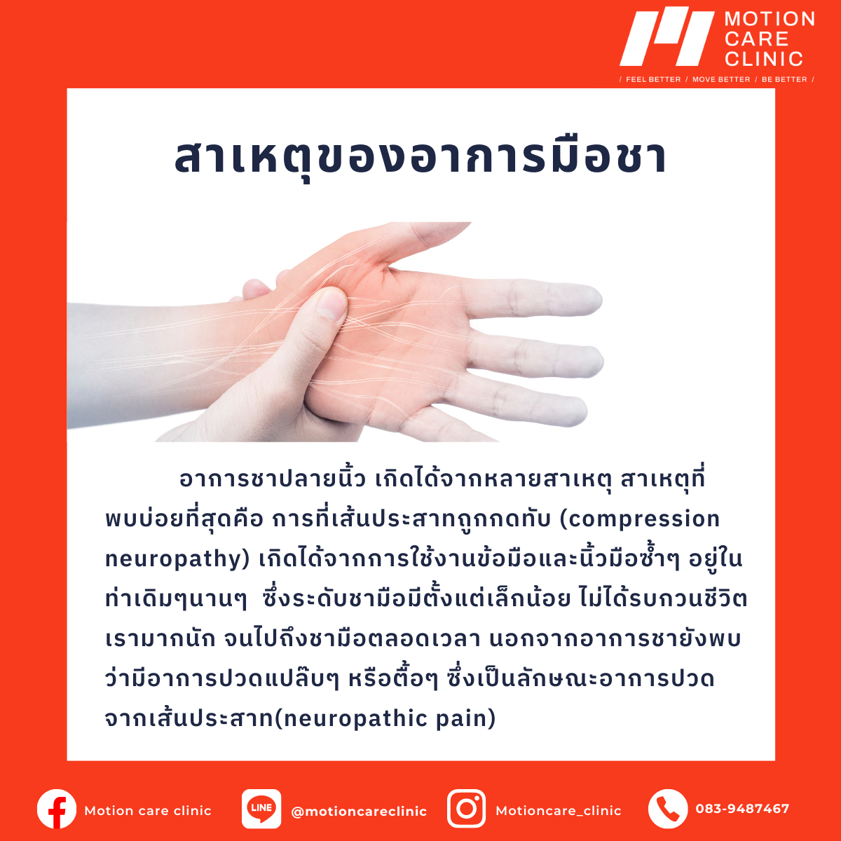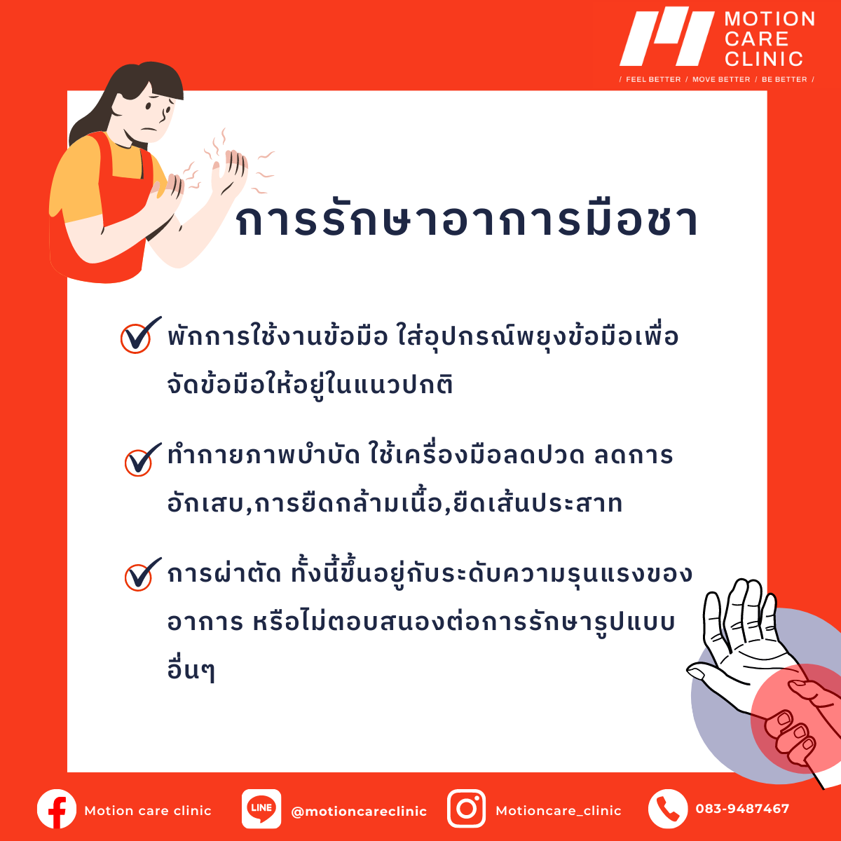 อาการชาเหล่านี้สามารถรักษาได้โดยหลีกเลี่ยงกิจกรรมที่ทำซ้ำ ยืดกล้ามเนื้อ เส้นประสาทด้วยตนเอง หากมีอาการมากหรือไม่หายแนะนำให้พบแพทย์หรือนักกายภาพบำบัดเพื่อตรวจประเมินว่าอาการชามาจากเส้นประสาทเส้นไหน เพื่อรับการรักษาอย่างถูกต้องค่ะ หากมีอาการเหล่านี้สามารถปรึกษาได้ที่ Motion Care Clinic