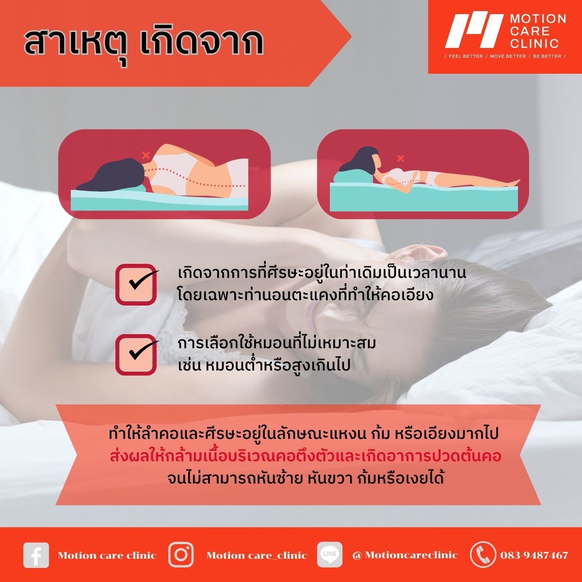 สาเหตุ เกิดจากการที่ศีรษะอยู่ในท่าเดิมเป็นเวลานาน โดยเฉพาะท่านอนตะแคงที่ทำให้คอเอียง และการเลือกใช้หมอนที่ไม่เหมาะสม เช่น หมอนต่ำหรือสูงเกินไป ทำให้ลำคอและศีรษะอยู่ในลักษณะแหงน ก้ม หรือเอียงมากไป ส่งผลให้กล้ามเนื้อบริเวณคอตึงตัวและเกิดอาการปวดต้นคอจนไม่สามารถหันซ้าย หันขวา ก้มหรือเงยได้