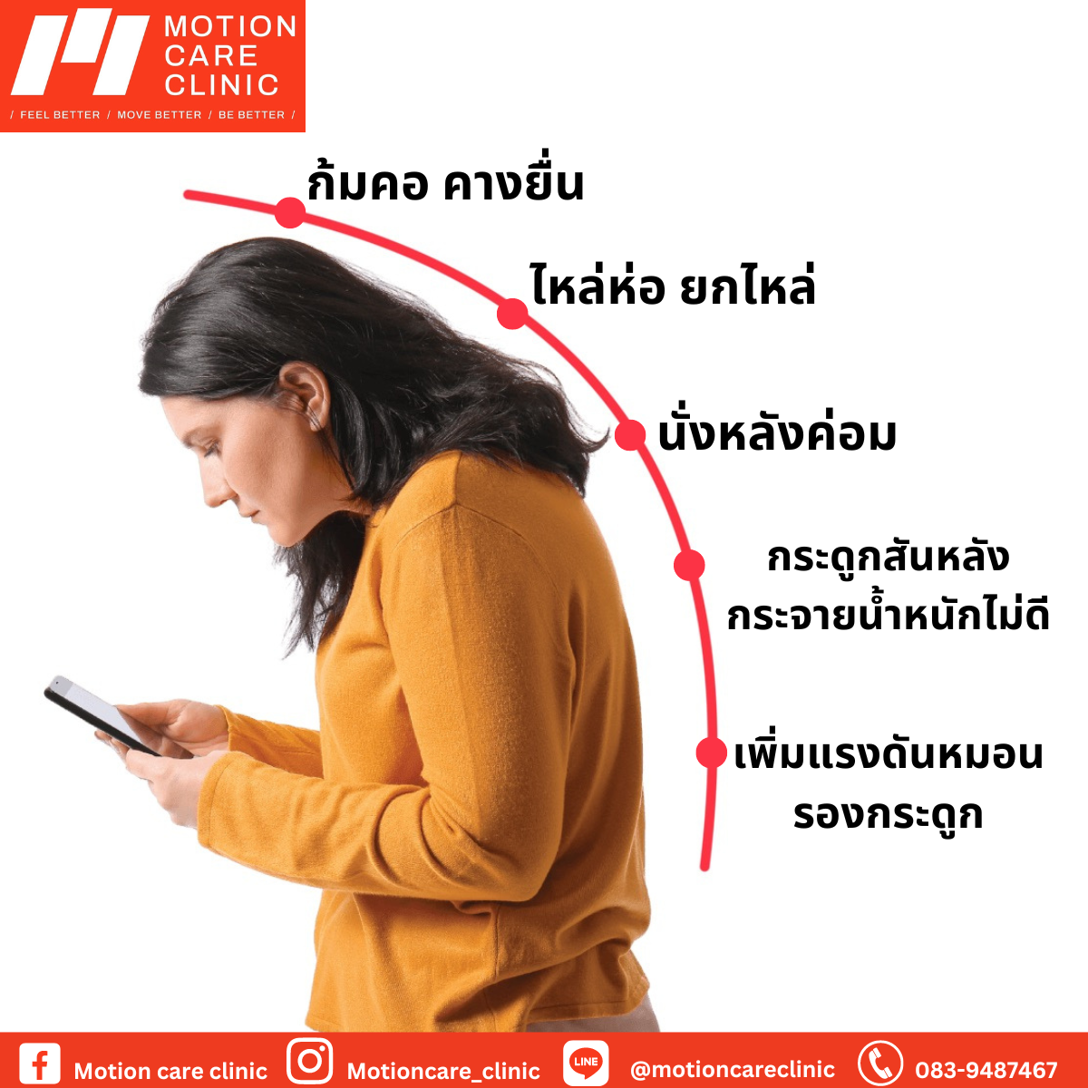 - ก้มคอ คางยื่น ไหล่ห่อ ยกไหล่ ไม่มีที่รองรับแขน ทำให้มีอาการปวดคอ
